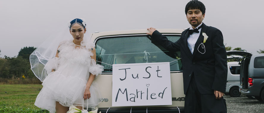 空き缶をデコレーションしたJumpeiさんの愛車での入場は、アウトドアだからこそ映える演出。